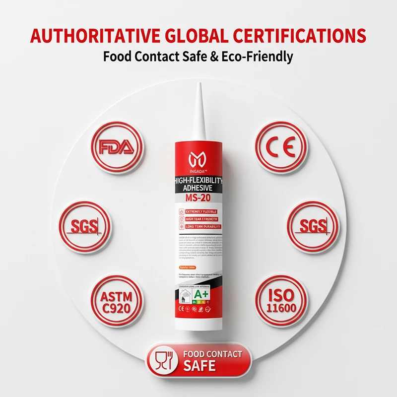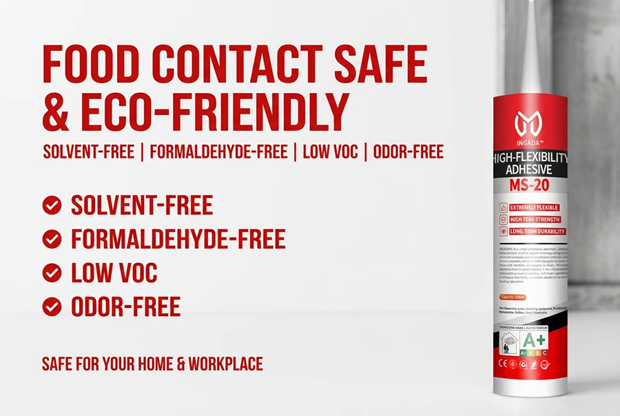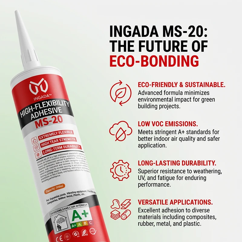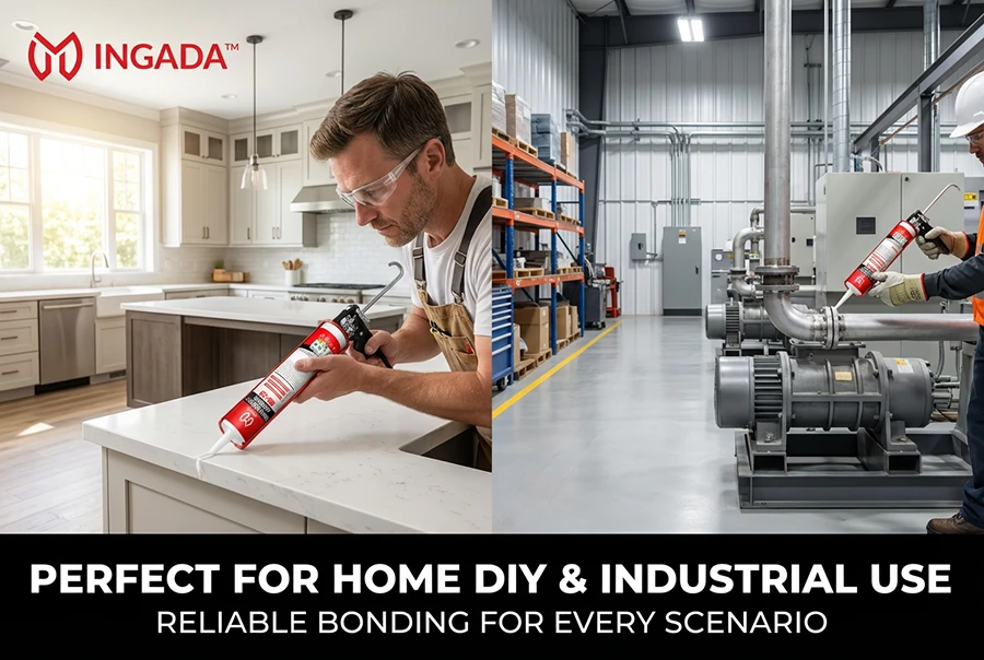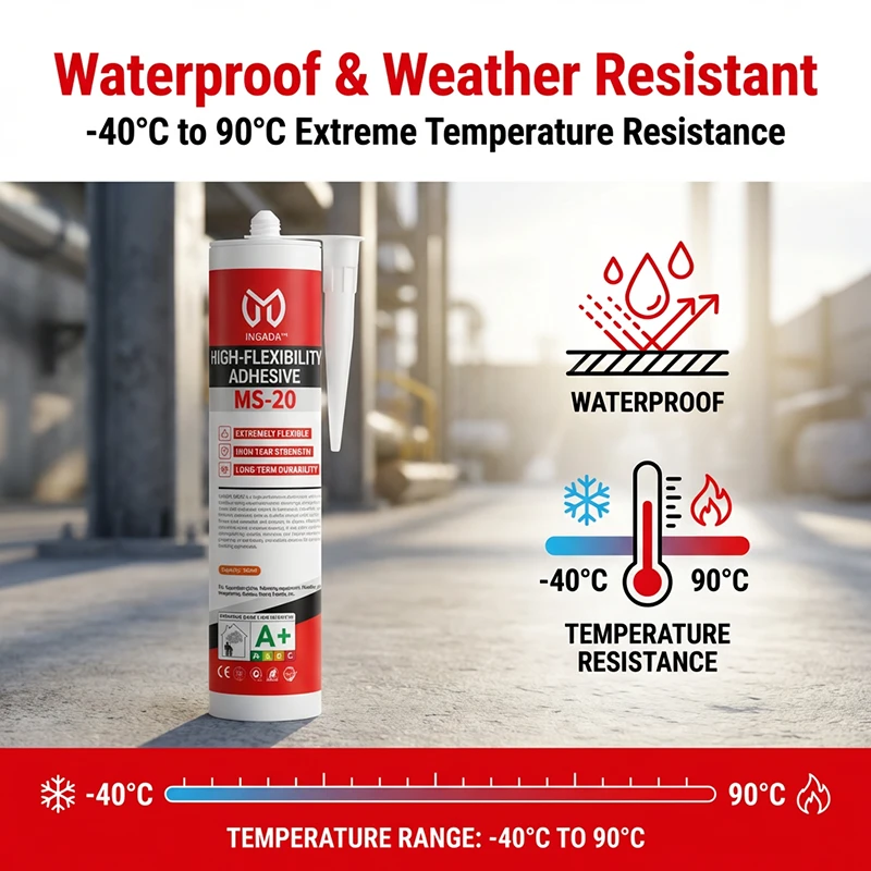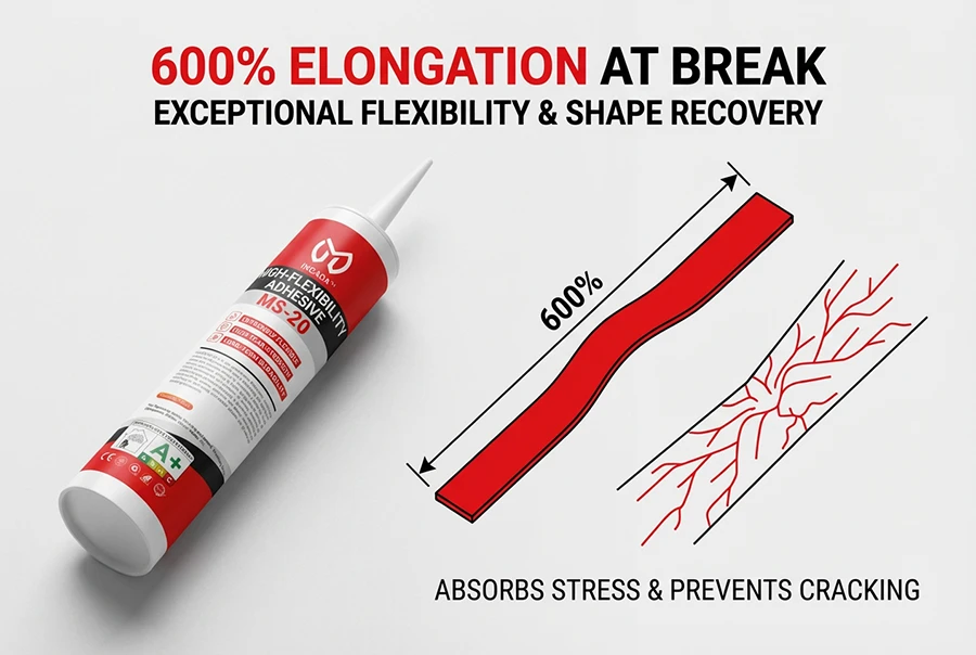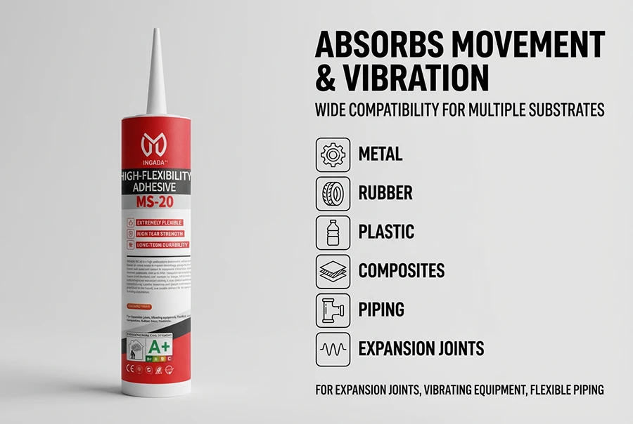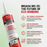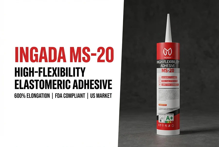 INGADA MS-20 is a high-performance elastomeric adhesive based on silane-modified polymer technology, designed for joints and substrates subject to movement, vibration, and thermal expansion. With up to 600% elongation at break, it flexes with materials and recovers its shape, effectively absorbing stress to prevent cracking. It also offers excellent waterproofing, weather resistance, and fatigue resistance, providing an eco-friendly and reliable solution for dynamic bonding applications.