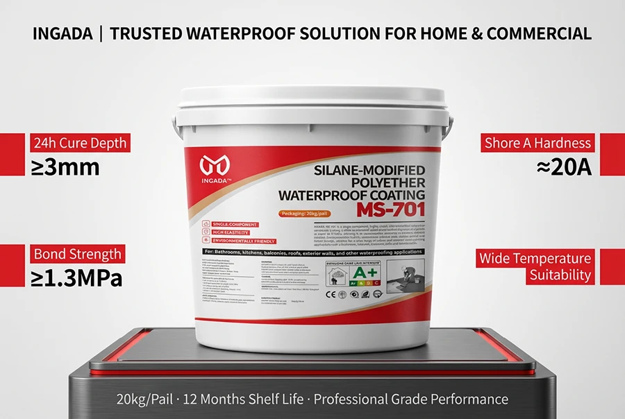INGADA MS-701 is a single-component, highly elastic silane-modified polyether waterproof coating. It offers excellent self-leveling and workability, with elongation at break of ≥450%, allowing it to accommodate substrate movement without cracking. Environmentally friendly, solvent-free, and non-toxic, it dries quickly and bonds strongly, suitable for a wide range of indoor and outdoor waterproofing applications such as bathrooms, kitchens, balconies, roofs, and exterior walls.