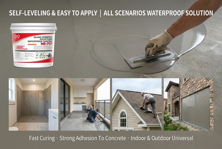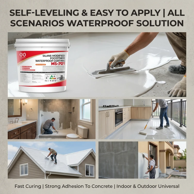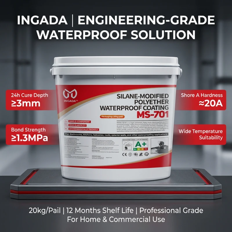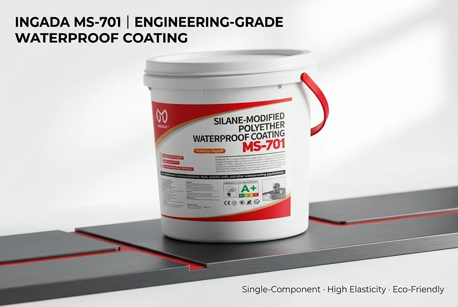 INGADA MS-701 is a single-component, highly elastic silane-modified polyether waterproof coating. It offers excellent self-leveling and workability, with elongation at break of ≥450%, allowing it to accommodate substrate movement without cracking. Environmentally friendly, solvent-free, and non-toxic, it dries quickly and bonds strongly, suitable for a wide range of indoor and outdoor waterproofing applications such as bathrooms, kitchens, balconies, roofs, and exterior walls.