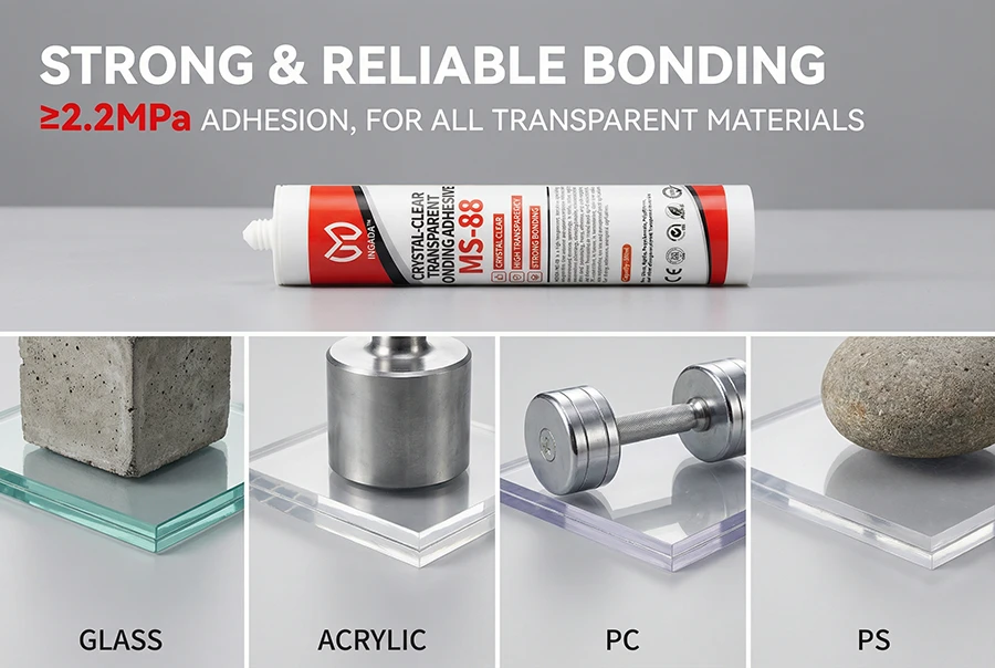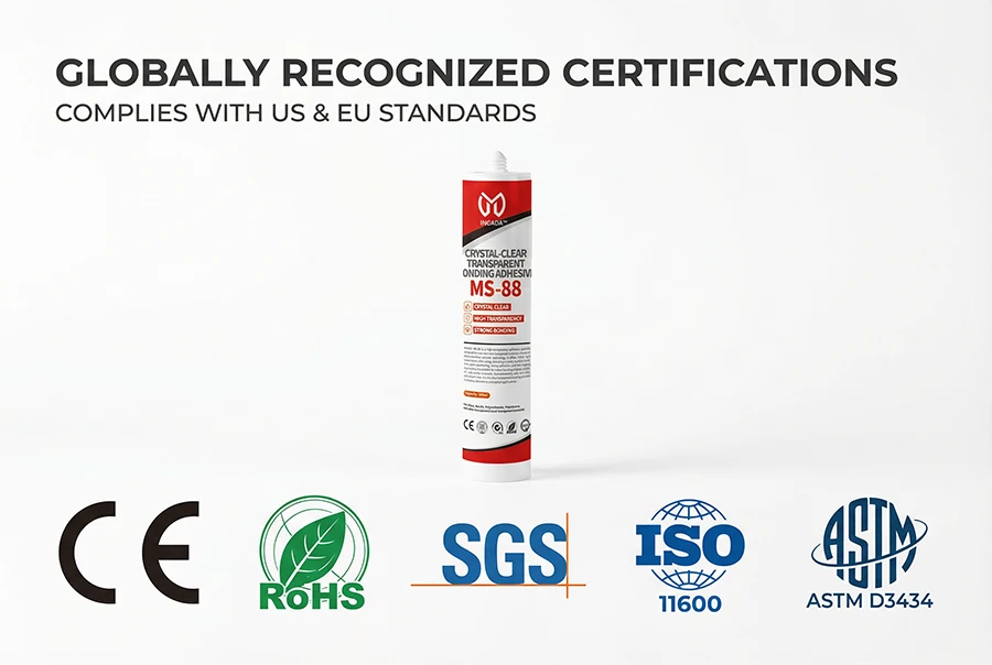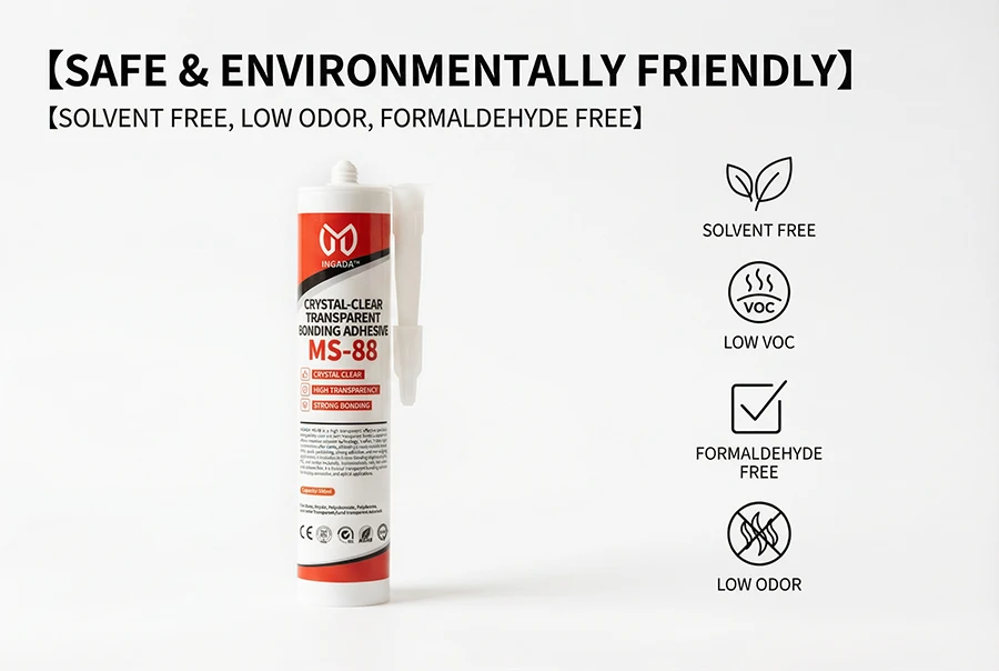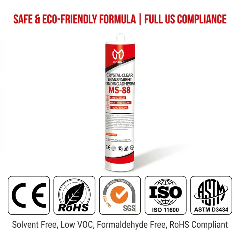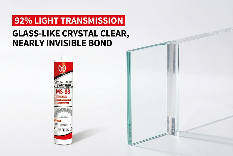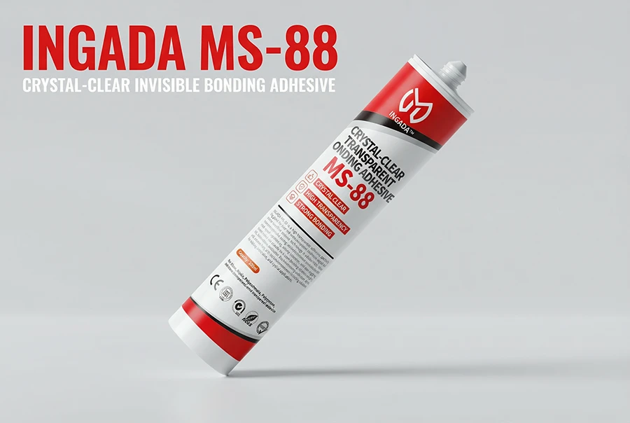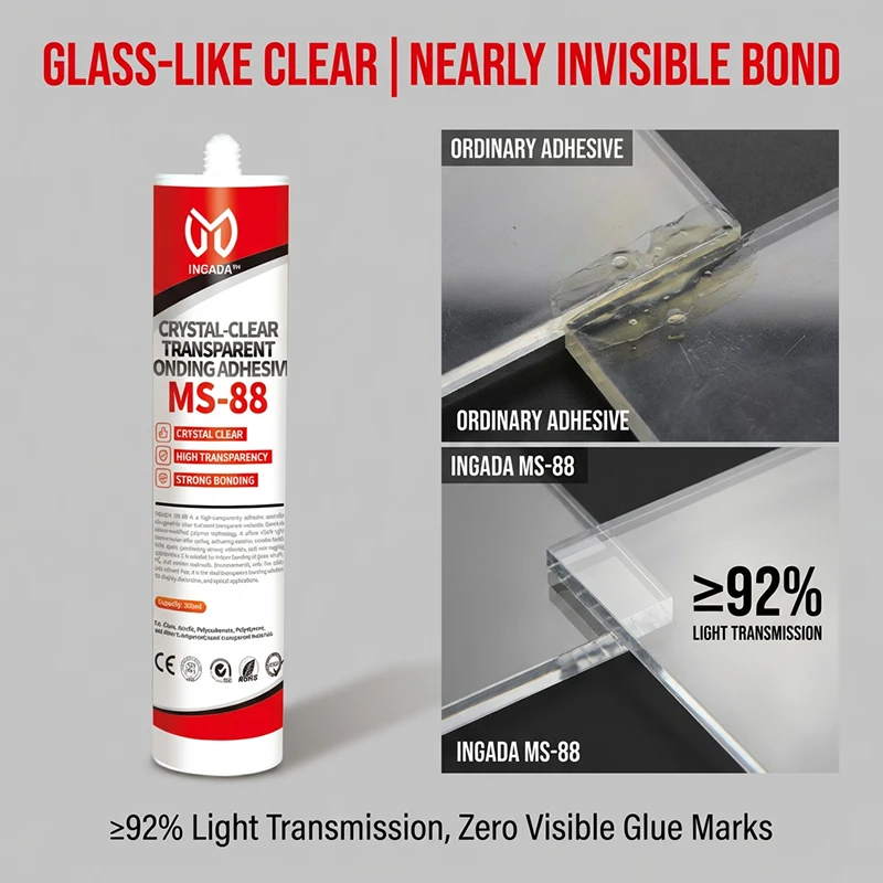 INGADA MS-88 is a high-transparency adhesive specially designed for clear and semi-transparent materials. Based on silane-modified polymer technology, it offers ≥92% light transmission after curing, delivering a nearly invisible bond. With quick positioning, strong adhesion, and non-sagging application, it is suitable for indoor bonding of glass, acrylic, PC, and similar materials. Environmentally safe, low odor, and solvent-free, it is the ideal transparent bonding solution for display, decorative, and optical applications.
