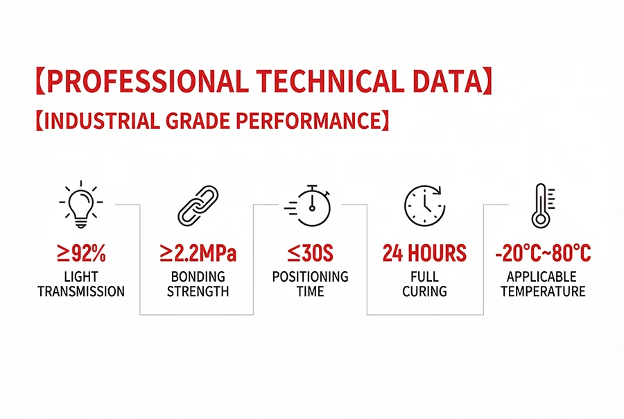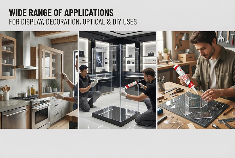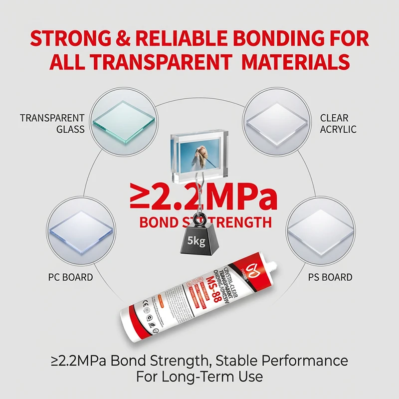 - Applications: Indoor bonding of glass, acrylic, PC, PS, and other transparent/semi-transparent materials.