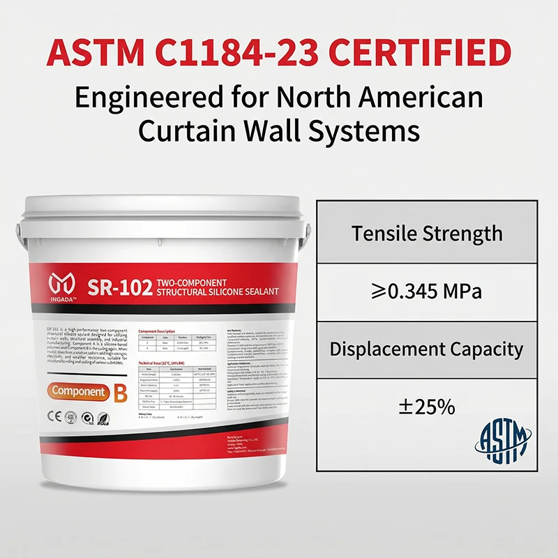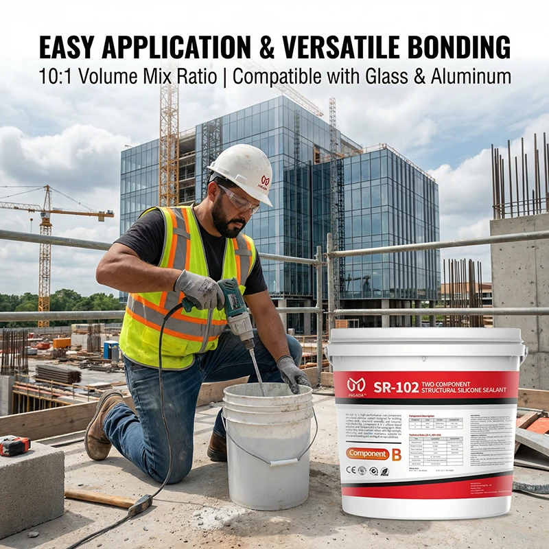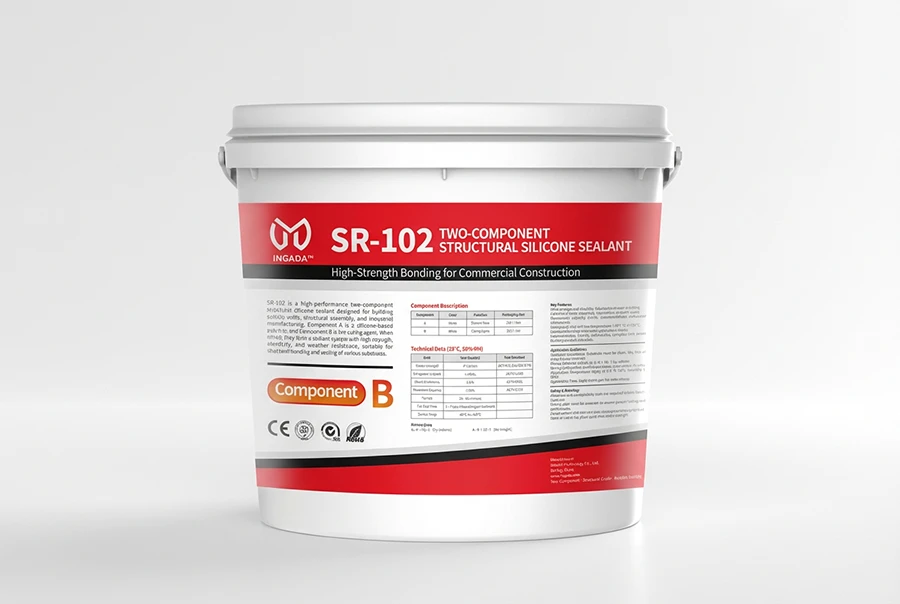 SR-102 is a high-performance two-component structural silicone sealant designed for building curtain walls, structural assembly, and industrial manufacturing. Component A is a silicone-based polymer, and Component B is the curing agent. When mixed, they form a sealant system with high strength, elasticity, and weather resistance, suitable for structural bonding and sealing of various substrates.