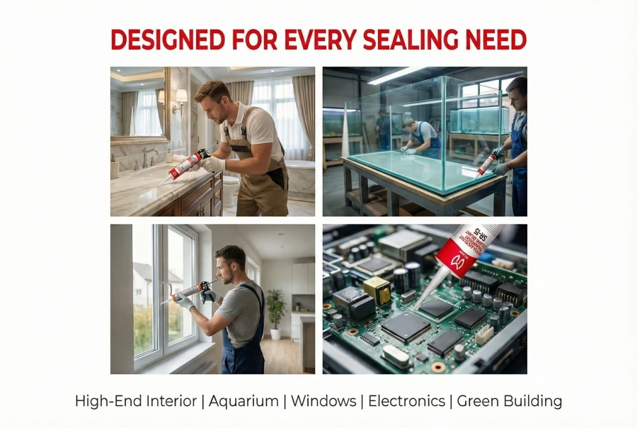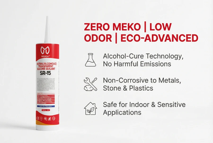 SR-15 is an eco-advanced, neutral-cure silicone sealant that releases environmentally preferred alcohol during curing, eliminating the release of butanone oxime (MEKO) commonly associated with oxime-type sealants. This makes it a safer, more sustainable choice for sensitive applications, offering superior compatibility with metals, plastics, and stone without risk of corrosion or staining. Its crystal-clear transparency, reliable adhesion, and low-odor formula make it the ideal choice for discerning indoor and exterior sealing where performance, aesthetics, and environmental responsibility converge.