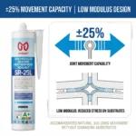 SR-25L is a versatile, low modulus silicone sealant offering reliable 25-grade movement capacity for general construction sealing where reduced stress and stain-free performance are desired. It provides an optimal balance of flexibility, adhesion, and weather resistance for sealing joints in windows, cladding, roofing, and interior/exterior applications. The white-oil-free formula makes it a dependable choice for both standard and sensitive substrates.