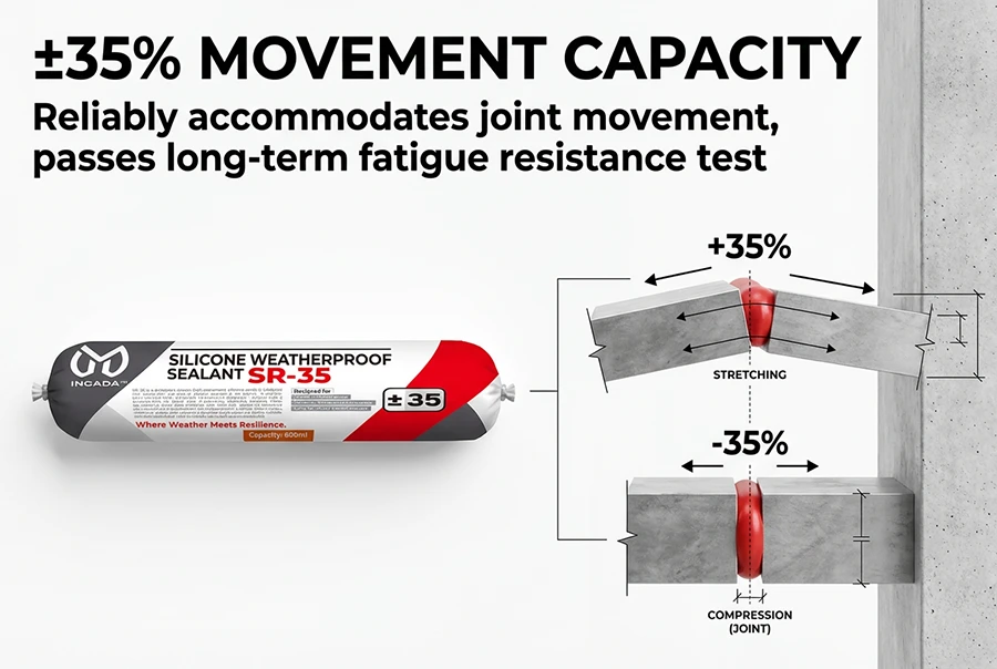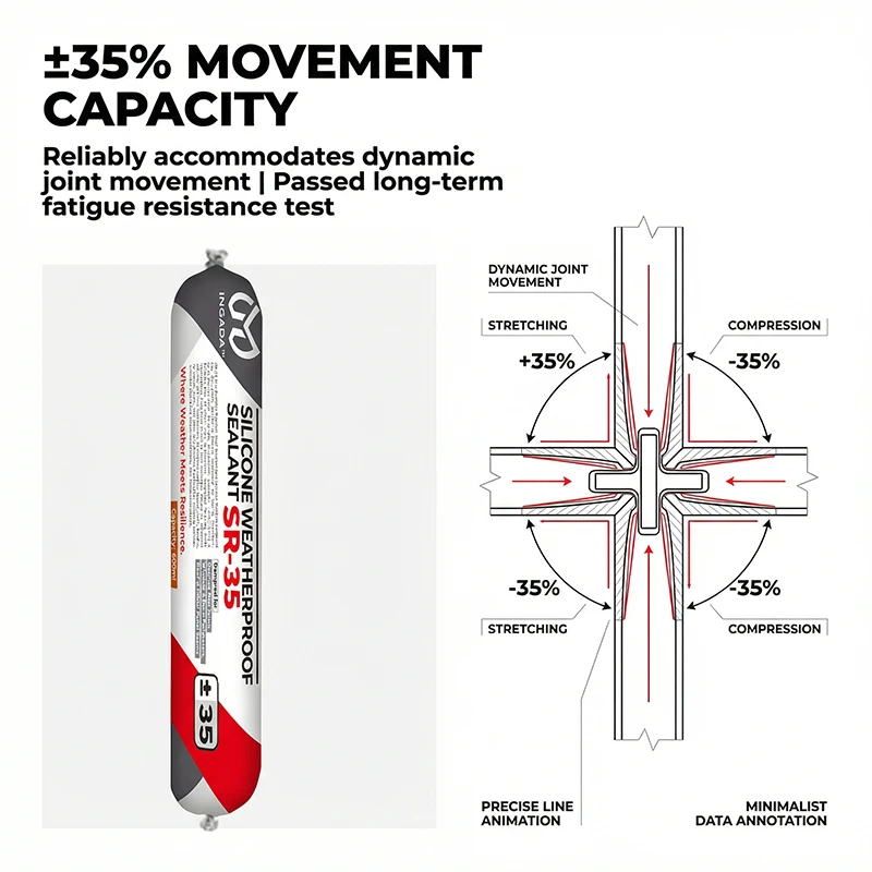 SR-35 is a premium-grade, high-movement silicone sealant designed for dynamic building joints exposed to harsh weather. With exceptional 35-grade movement capacity (±35%) and a formula free of white oils, it prevents substrate staining while maintaining long-term elasticity and adhesion. Based on advanced silicone polymer technology, it is engineered for curtain walls, façades, windows, roofs, and other architectural applications requiring reliable weather resistance and structural movement accommodation.