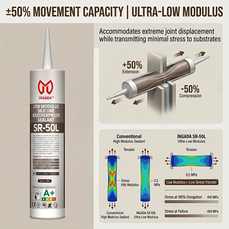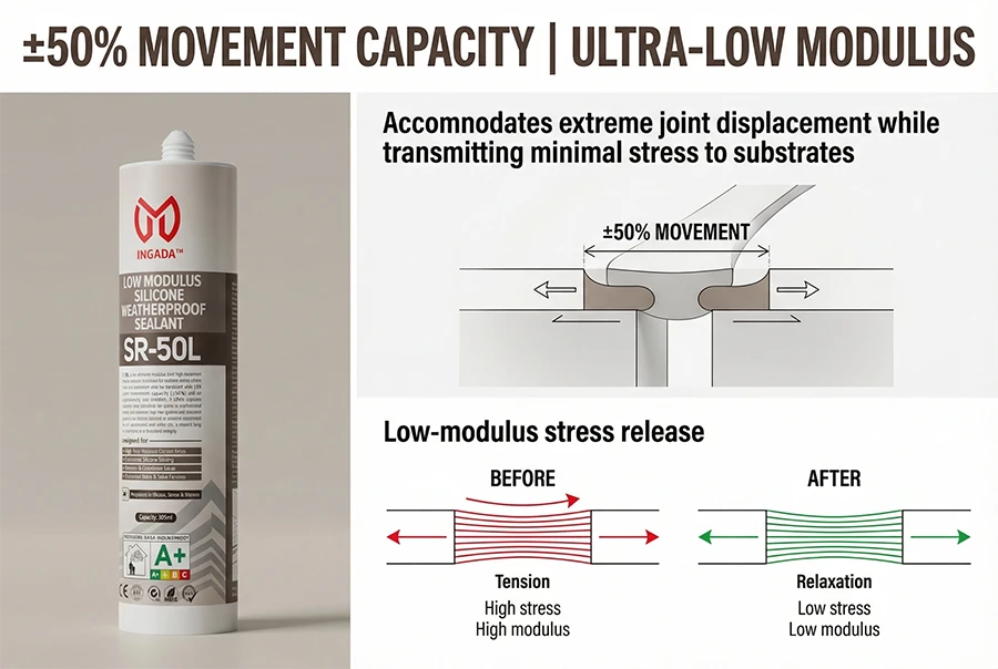 SR-50L is an ultra-low modulus, ultra-high movement silicone sealant developed for precision sealing where stress on substrates must be minimized. With a 50-grade movement capacity (±50%) and an exceptionally low modulus, it offers supreme flexibility and durability for joints in sophisticated curtain wall systems, high-rise façades, and structures exposed to intense thermal or dynamic movement. Free of plasticizers and white oils, it ensures long-term aesthetic and functional integrity.