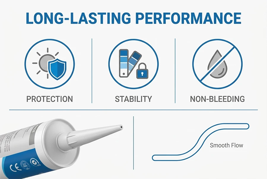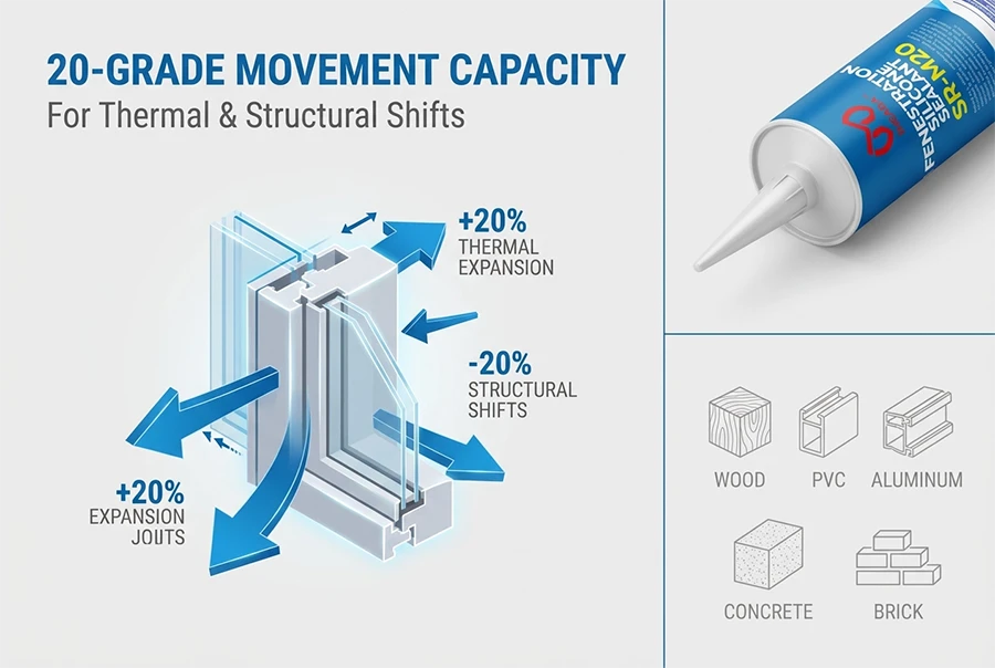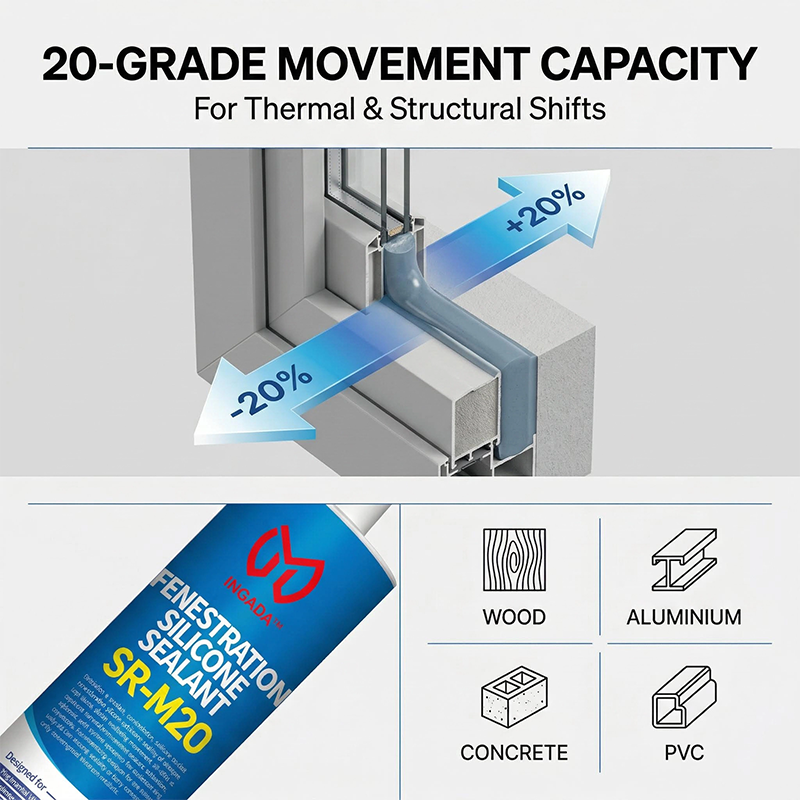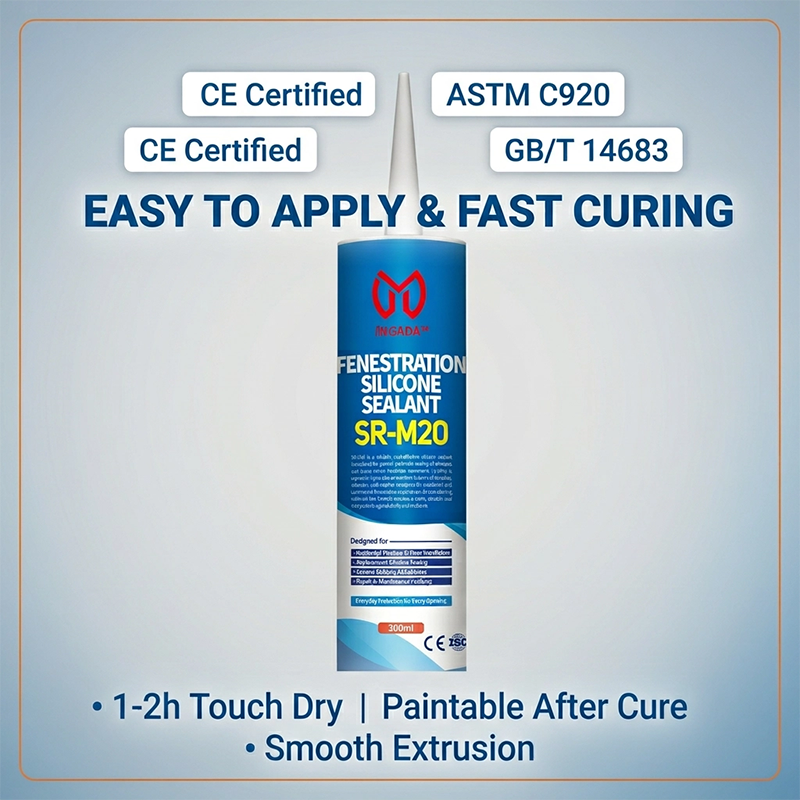 SR-M20 is a reliable, cost-effective silicone sealant formulated for general perimeter sealing of windows and doors where moderate movement (±20%) is expected. It provides an excellent balance of elasticity, adhesion, and weather resistance for residential and commercial fenestration applications. Its non-staining, white-oil-free formula ensures a clean, durable seal that protects against drafts and moisture.
